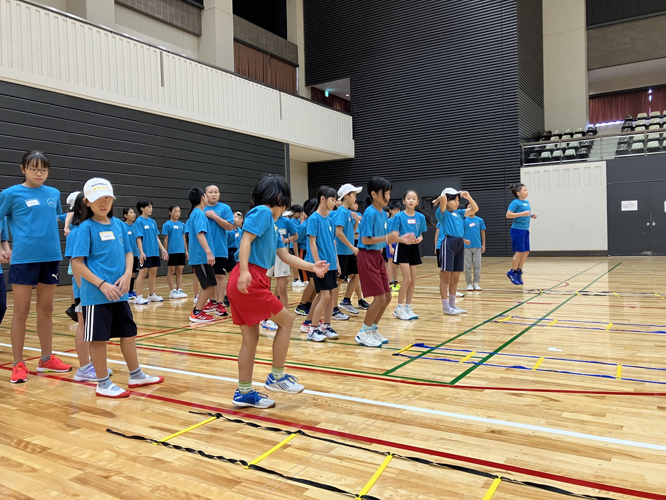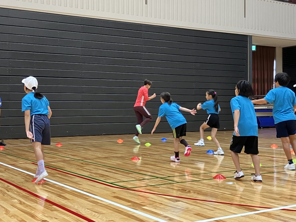 ウォームアップが終了した後は明日香さんの“走る”講座です。最初は遊びながら体幹部を刺激する動きをしたり、反応ゲームを行っていました。その後は、ラダーを使った動きに慣れないながらも一生懸命に足を動かしている子どもたちが印象的でした。そのあとも歩く姿勢やミニハードル、変形ダッシュをしてトップアスリートの講座に子どもたちは、最後まで笑顔で楽しそうに活動していました。明日香さんの子どもたちへの接し方や内容など参考になることが多かったので、いい勉強にもなりました。