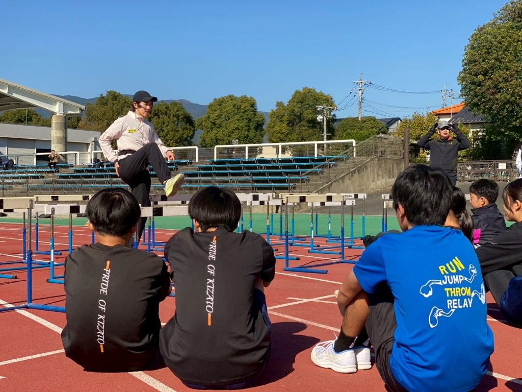 教室では、3つの部門に分かれ第1部は小学生対象の走り方教室、第2部は中高生対象の走り方教室、第3部はハードラーのためのハードル教室を行いました。総勢174名の生徒さんが参加され、大盛況でした。第1部では、色々な遊びを取り入れながらバランス、俊敏性、体幹を使ったアップを行いました。その後は股関節を大きく使うためにハードルをまたぎ、走り方のポイントである「身体は真っすぐのまま前で足を入れ替える」ことを伝えました。第2部では中高生対象のため、専門的なスプリントドリルをメインに展開しました。リズムが難しかったり、足の動かし方、姿勢の取り方など最初は難しそうにしていましたが、ポイントを掴んで徐々にできるように変化していたので感心しました!第3部では、ハードルドリルとショートインターバルをメインに跳びました。初めてハードルをする子もいましたが、みんなが真剣に話を聞いてくれ、動きが変わっていくのを感じました。鳥栖から素晴らしい選手が出るのを楽しみにしています!